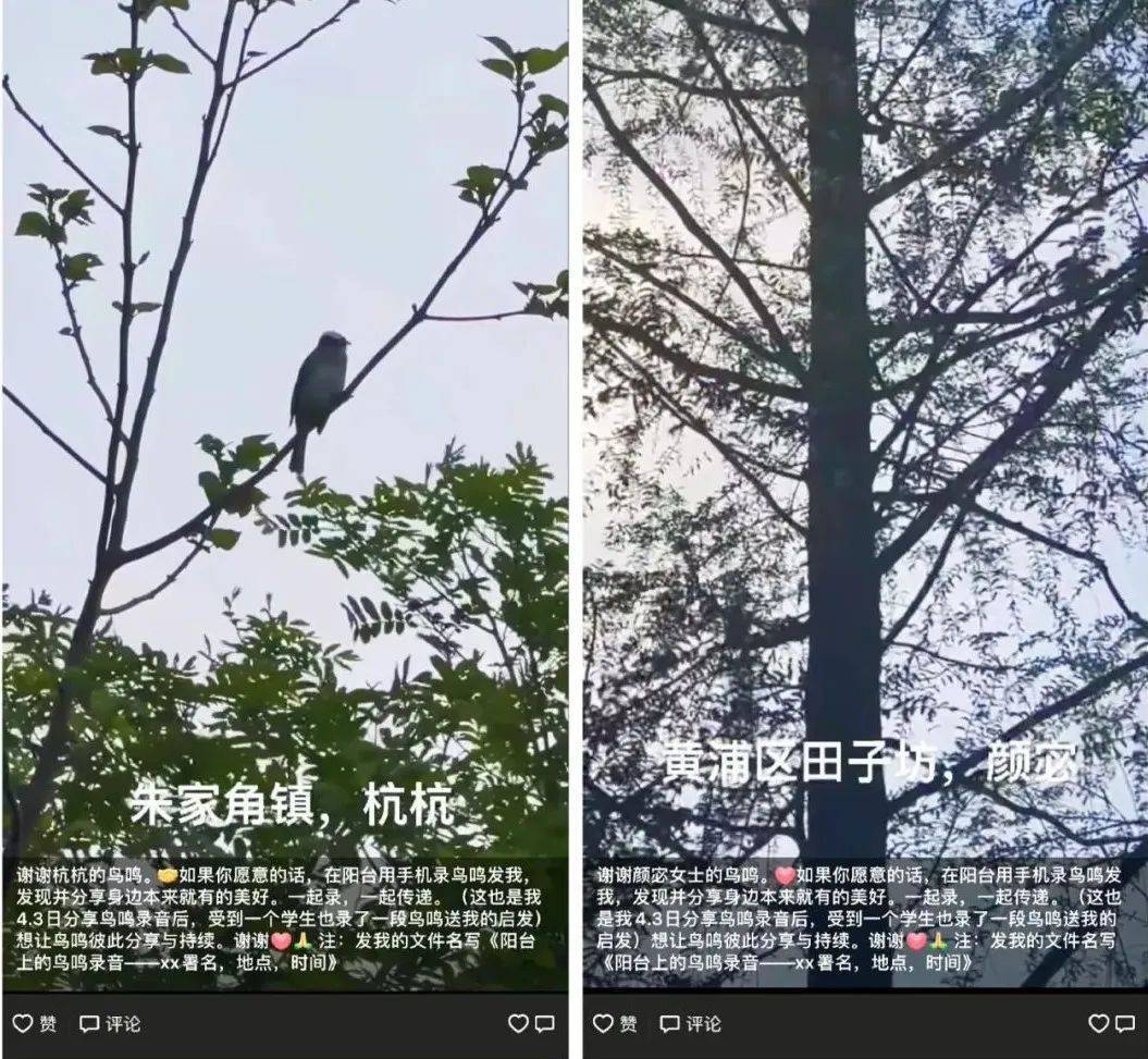 其中有一个收到的人是个大学生,他给我回了一段在他宿舍那边录的鸟叫声,不太一样,但也特别好听。我就想,干脆发起一个活动,叫“鸟鸣电台”,让大家记录疫情中在自家听到的鸟鸣。其实这份美好一直存在于我们身边,只是平时被忙碌的我们忽略掉了。