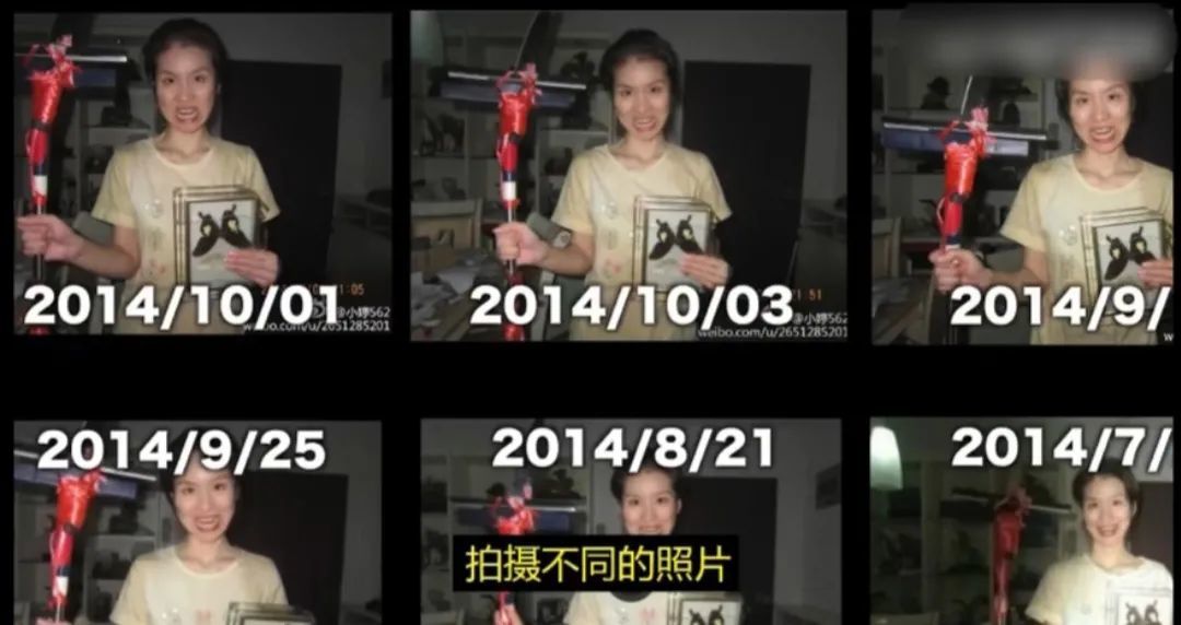 她每张照片的右下角都有时间水印,不变的衣服、不变的拖把、菜刀、死亡蝴蝶,拍摄时间集中在晚上9点到10点之间。