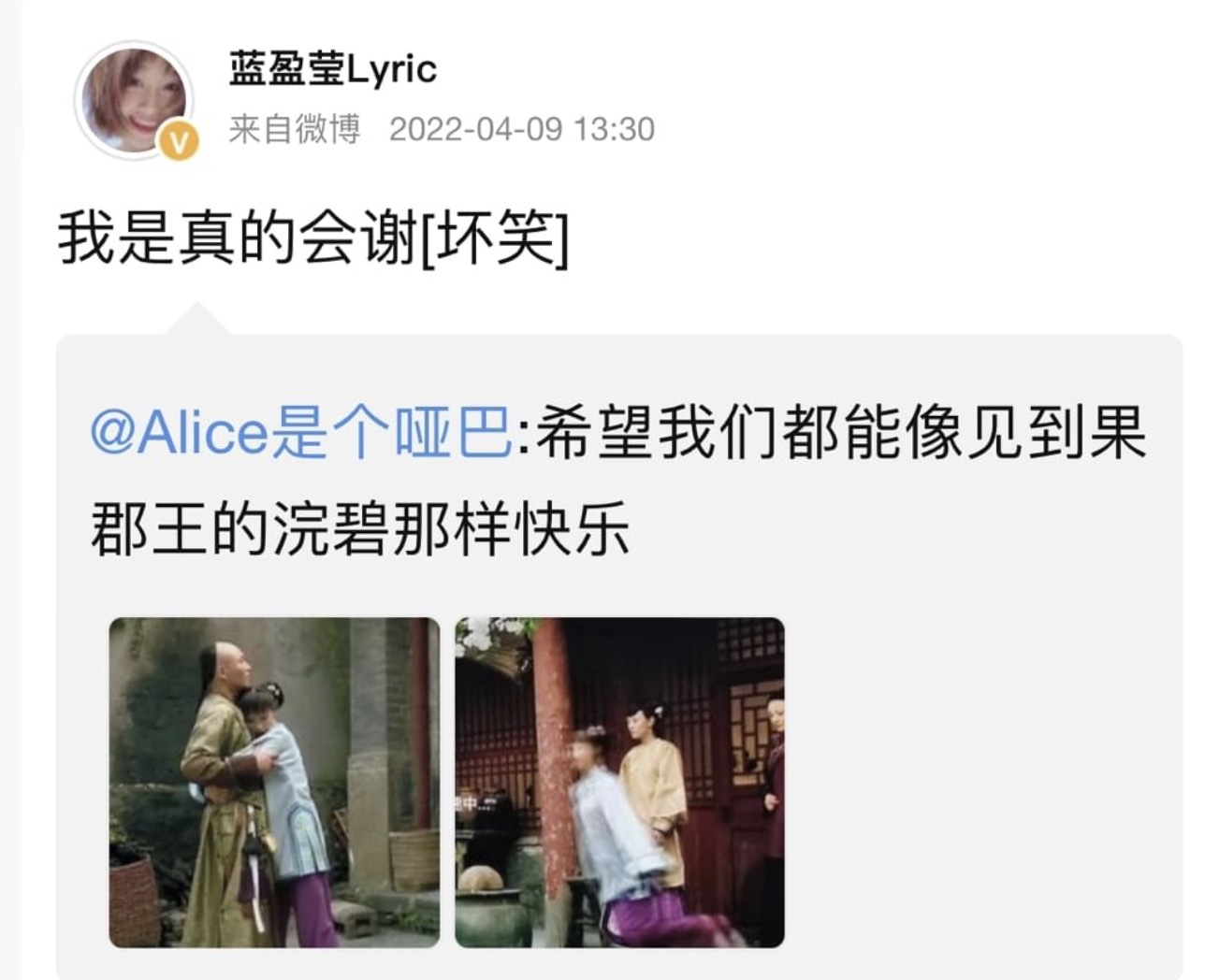 近日,蓝盈莹转发了一条网友微博,该条微博分享了两张浣碧见到果郡王时极度欢乐的剧照,并配文道:“希望我们都能像见到果郡王的浣碧那样快乐。”剧照中由蓝盈莹饰演的浣碧已经快乐出了重影,只剩下模糊的画面。也难怪蓝盈莹亲自下场回应:“我是真的会谢。”
