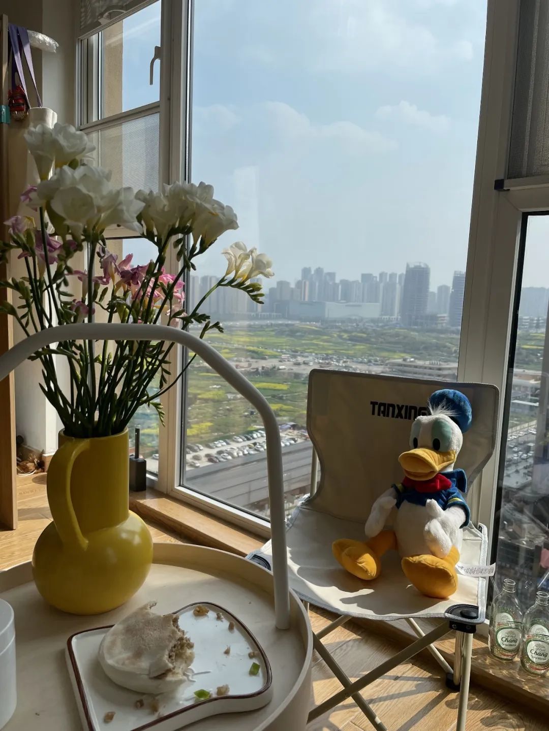 长大后她也买了带飘窗的房子,“现在的飘窗更长也越宽了”。