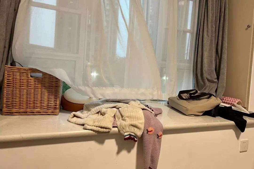 同桌@瑞贝卡 拍来她的飘窗,是每一个飘窗的缩影,“堆的全是衣服”,早上在里面刨两下选出一件相对干净的穿上。