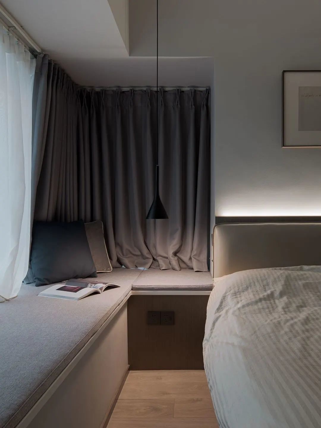 这种风格要求就是简洁宽敞,不能有多余的线条,有一点做旧感,飘窗的出现就是画蛇添足,一颗老鼠屎坏了一个氛围。