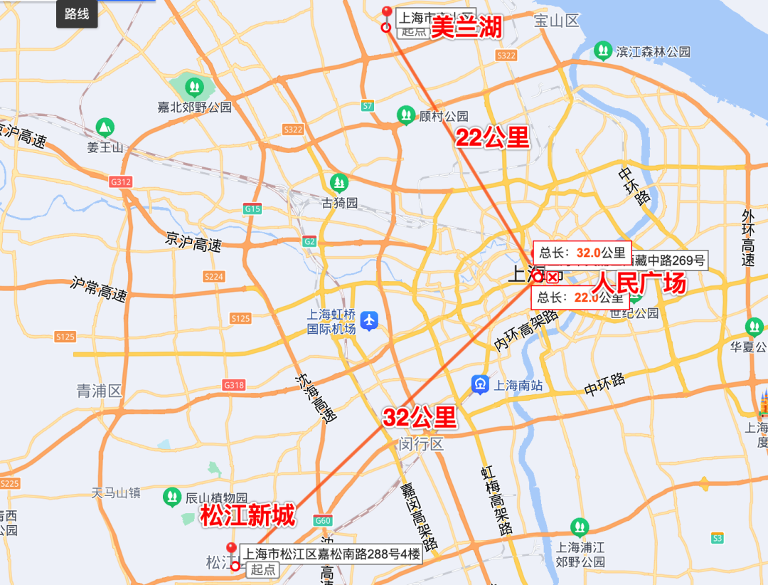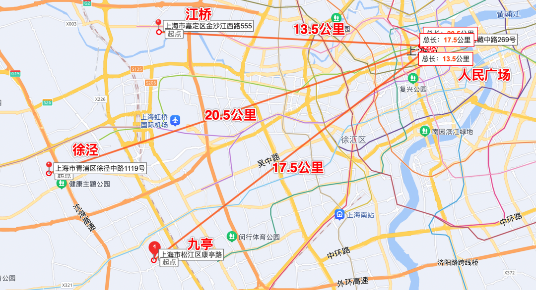 另外,这里紧邻外环线,到人民广场直线距离只有13.5公里,同属外环,徐泾、九亭到人民广场都要20公里左右。