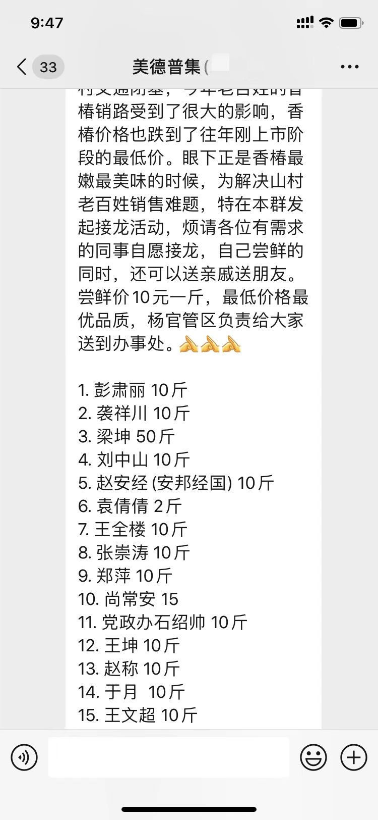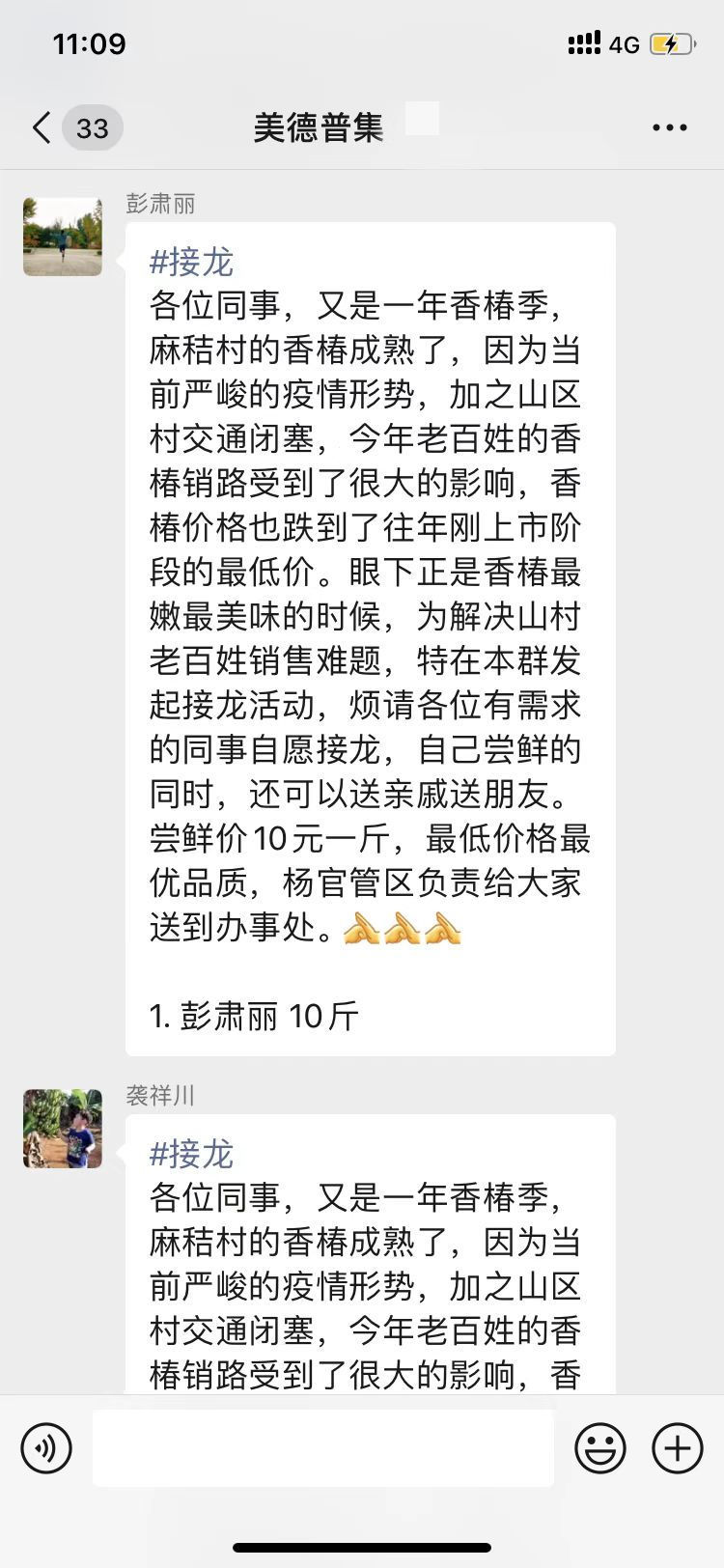管理区总支书记袭祥川和主任彭肃丽深入麻秸村香椿生产的田间地头,询问相关情况,帮助制定销售方案。线下用脚步丈量民情,线上,用爱心接龙助农。彭肃丽在群里发起了助力麻秸销售的爱心接龙,号召广大机关干部伸援手、献爱心,解群众燃眉之急。一时间,你五斤,他十斤,大家纷纷响应,接力爱心。