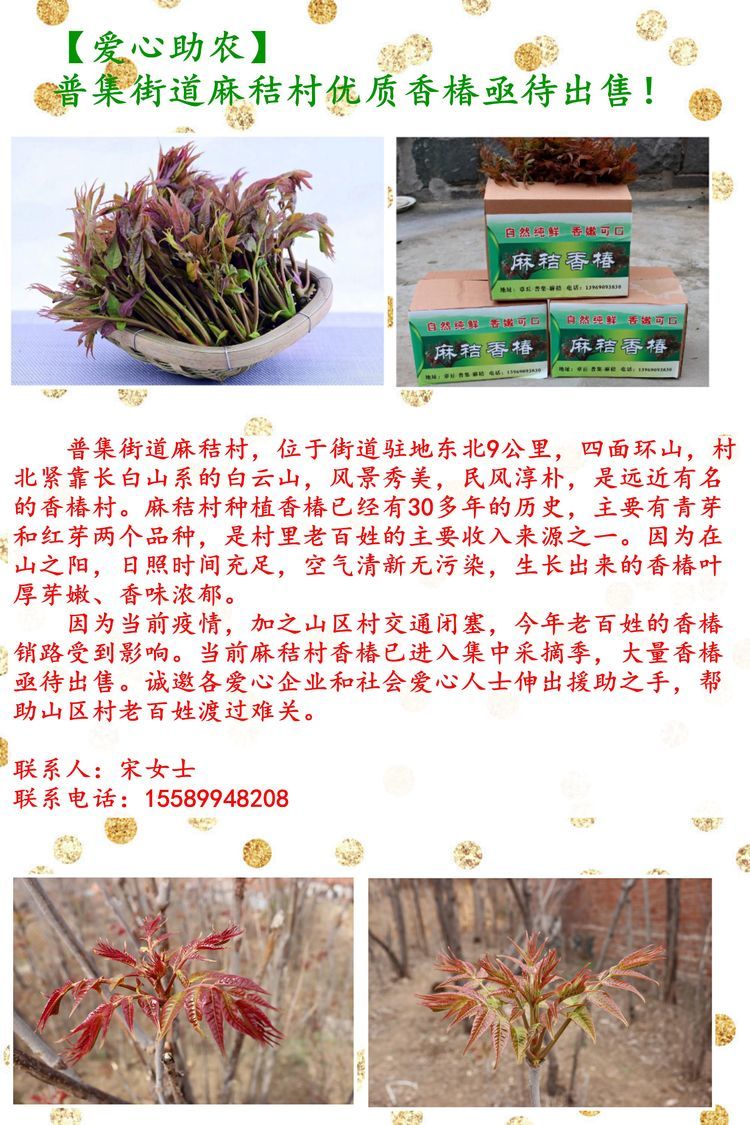 麻秸村种植香椿已有30多年历史,村内早些年成立了经济合作社,由村支部书记柏立珍进行管理,在柏书记的带领下,每年村里产的香椿都供不应求。但是今年受疫情的影响再加上柏立珍因病住院,麻秸村香椿芽销售渠道受到阻断,陷入了滞销的困境。