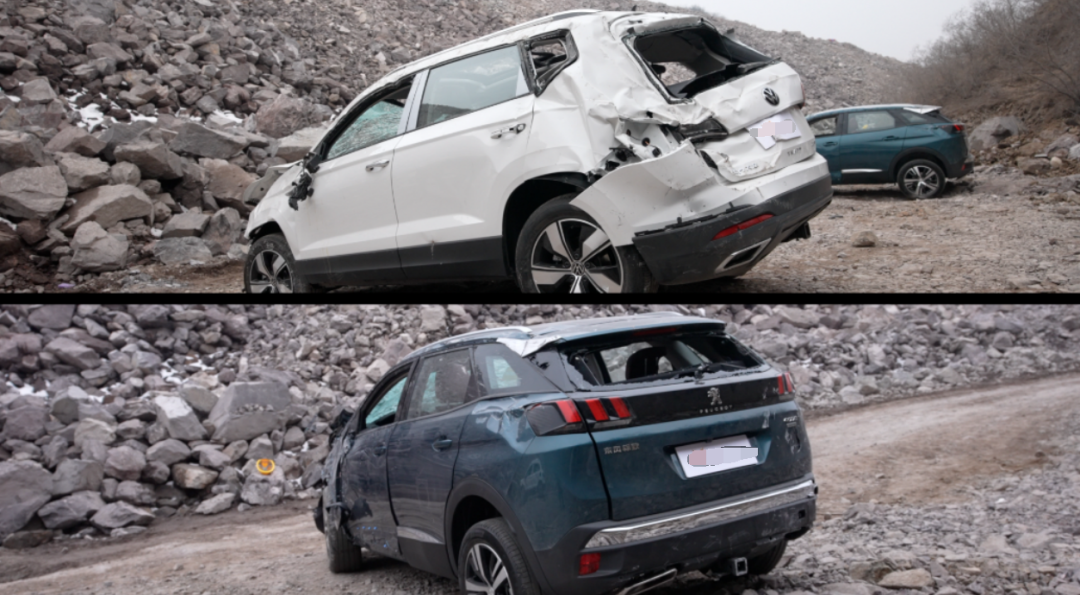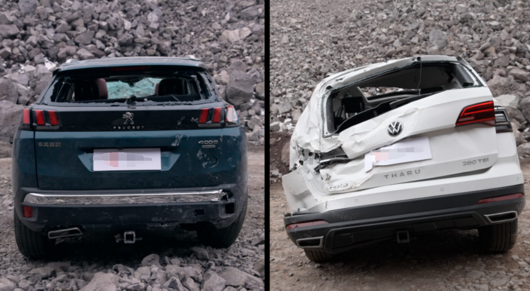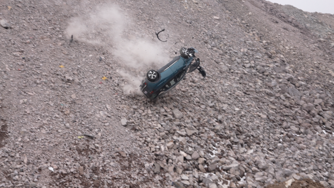 我们来看看另外一种测试方式。虽然简单,但是更被认同。就在近日,车评人区长,在抖音号“毒辣车评”发布的“德日法美韩,合资SUV谁最强悍”中,将两台SUV从碎石坡顶推下。经过数十米高度落差的自由翻滚,再检查车身受损情况。这样的测试,比文章开头提到传统的车身强度静态压力测试更暴力更直接,但是也更真实。一方面,“终极山崖翻滚测试”不仅不可控,难以在测试中进行人为性的干预,而且就测试本身而言,也更符合真实际场景——就是对山路翻车的模拟测试。