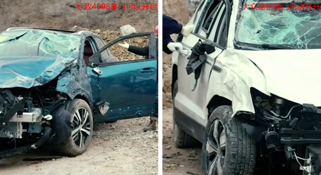 果然,可以看到经过翻滚落地的标致4008车身整体架构没有大的损伤。最关键A柱、B柱、C柱、D柱均都保持了完好的形态。车身框架也没有入侵车身。而且车门可以很轻松的打开,确保了伤员可以快速离开。
