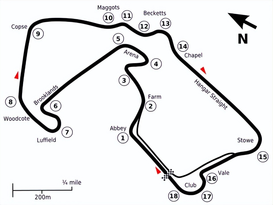 银石赛道单圈长5.901公里,拥有18个弯角。