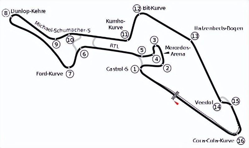 纽博格林南赛道单圈长5.148 公里,拥有16个弯角。