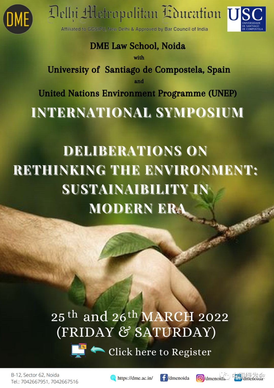 印度诺伊达的德里大都市教育(Delhi Metropolitan Education,DME)法学院组织的“现代环境的可持续性再思考”会议于2022年3月25日至26日举行。中国生物多样性保护与绿色发展基金会(简称“中国绿发会”“绿会”)副秘书长应邀参加。