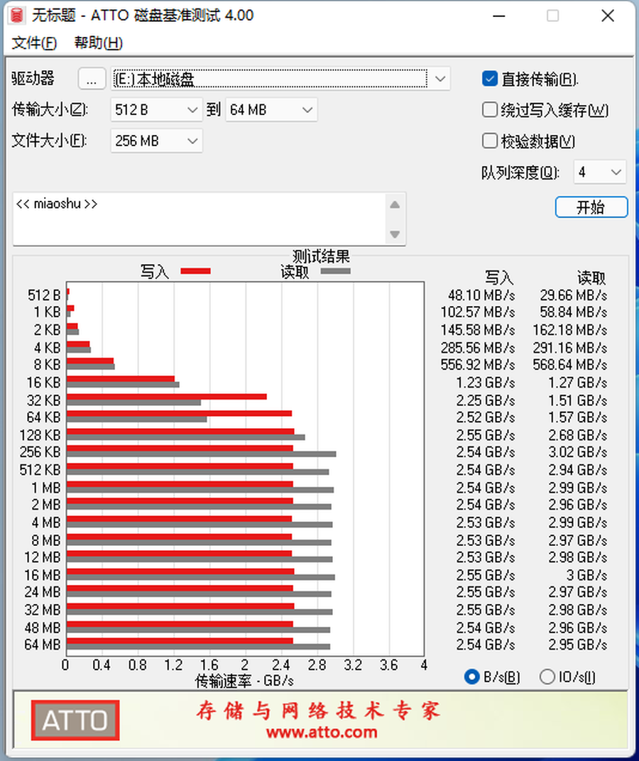 在ATTO Disk Benchmarks测试中,七彩虹战戟CN600 512GB SSD对于0.5KB的小文件读写速度分别达到约48MB/s和30MB/s表现良好;从256K开始,写入开始稳定在2.54GB/s、读取3GB/s左右。