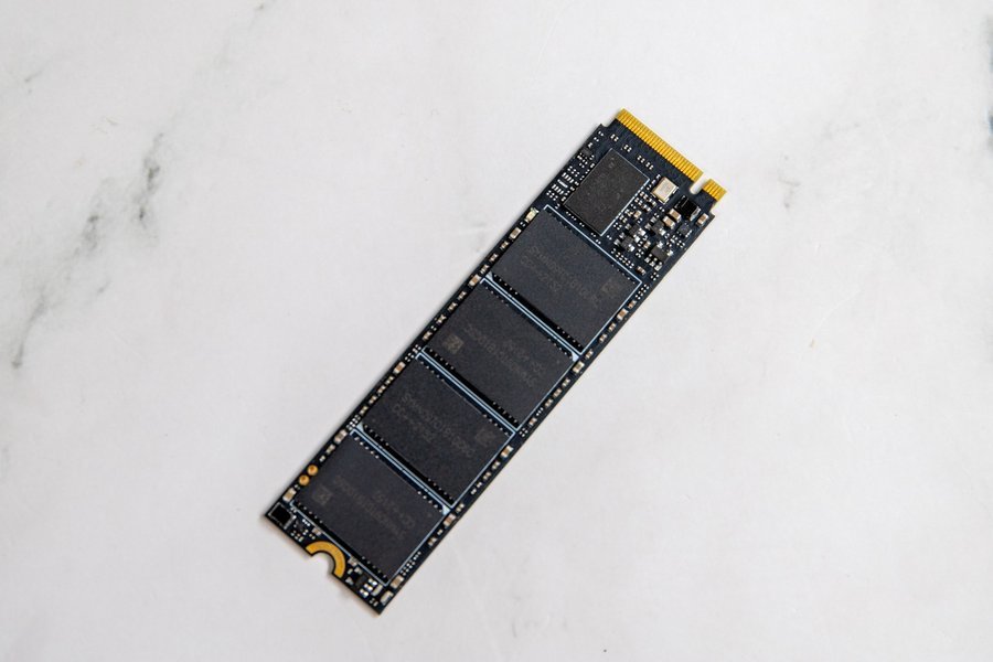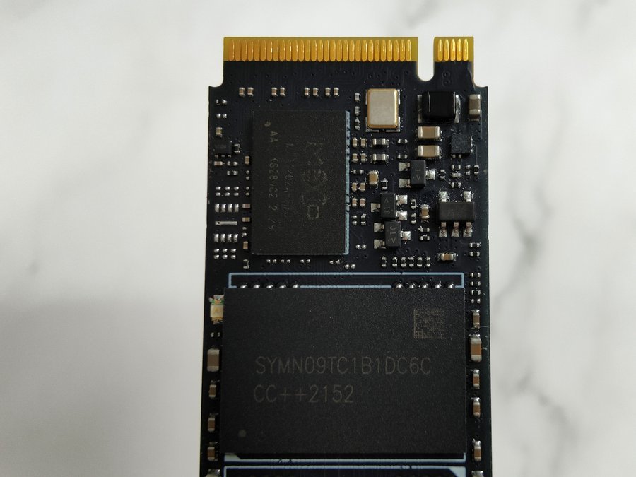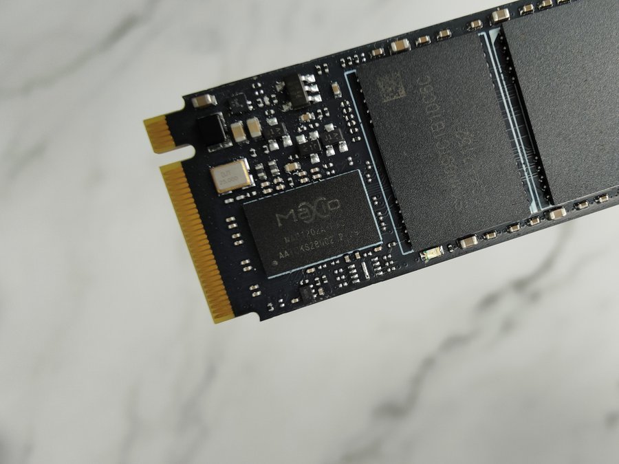 撕开正面散热贴,可以看到七彩虹战戟CN600的构成。硬盘PCB上贴有四颗长江存储的闪存颗粒,单颗容量128GB,总共512GB;插口侧为杭州联芸(Maxio)MAP1202A主控芯片,硬盘不带有独立缓存。