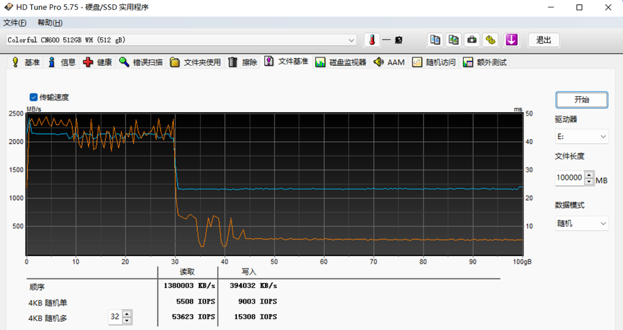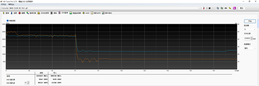 使用HD Tune进行200G文件基准测试,七彩虹战戟CN600 512GB在空盘下的缓存容量为60GB,缓内读写速度在2200~2500MB/s范围内。