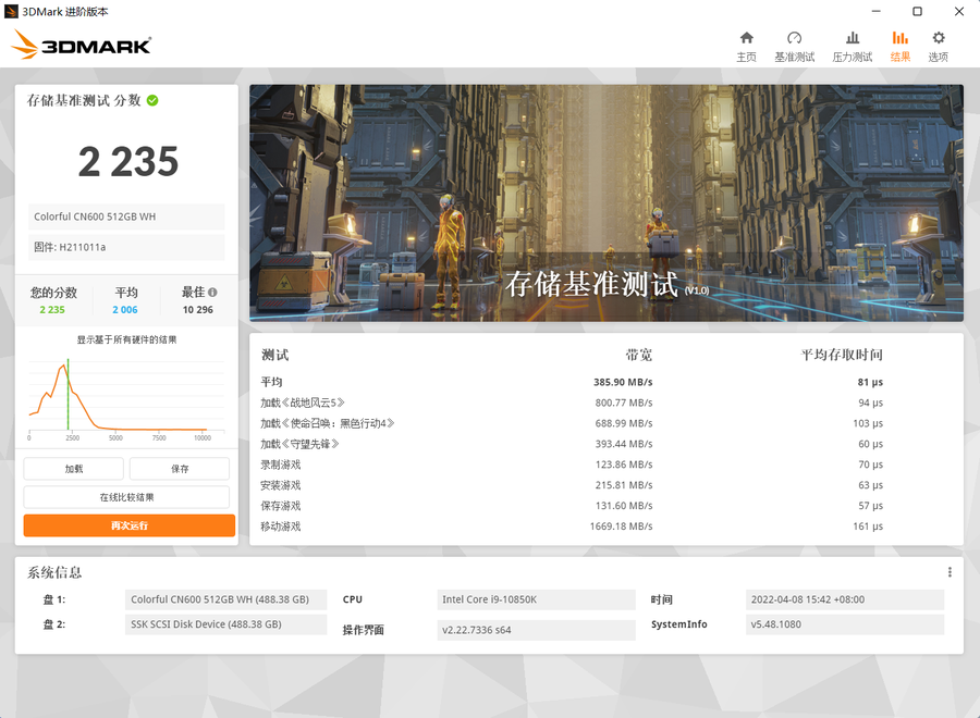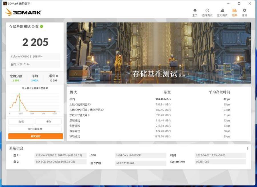 3DMark存储基准测试,这项测试主要模拟SSD对于游戏加载、安装、录制等情况下的性能表现。七彩虹战戟CN600 512GB得到了2205分,相比主流SATA固态分数几乎翻倍,也稍高于2000分的平均水平。