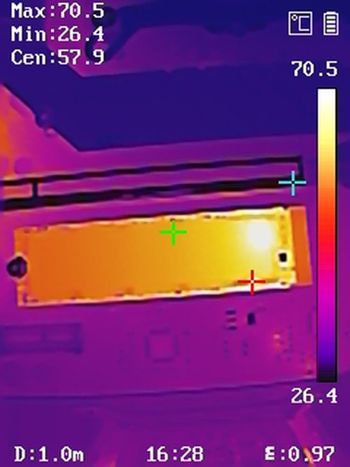 在运行32GB的CristalDisk Mark跑分过程中,我们还记录了这块硬盘的表面最高温度为70.5°C,和标称的10~70°C运行温度基本一致。