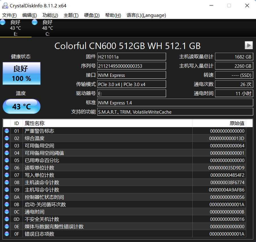 在CrystalDiskInfo中,我们可以看到,七彩虹CN600战戟的一些基本参数信息,包括接口、传输模式、充电次数等信息。