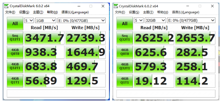 在CrystalDiskMark测试中,七彩虹CN600战戟的最大连续读取速度达到了3471MB/s,而最大连续写入速度也达到了2740MB/s,比起官方标称的速度还要更高,已经逼近中高端PCIe 3.0固态的性能水平。