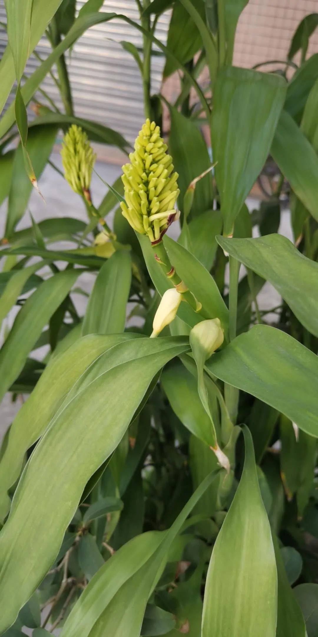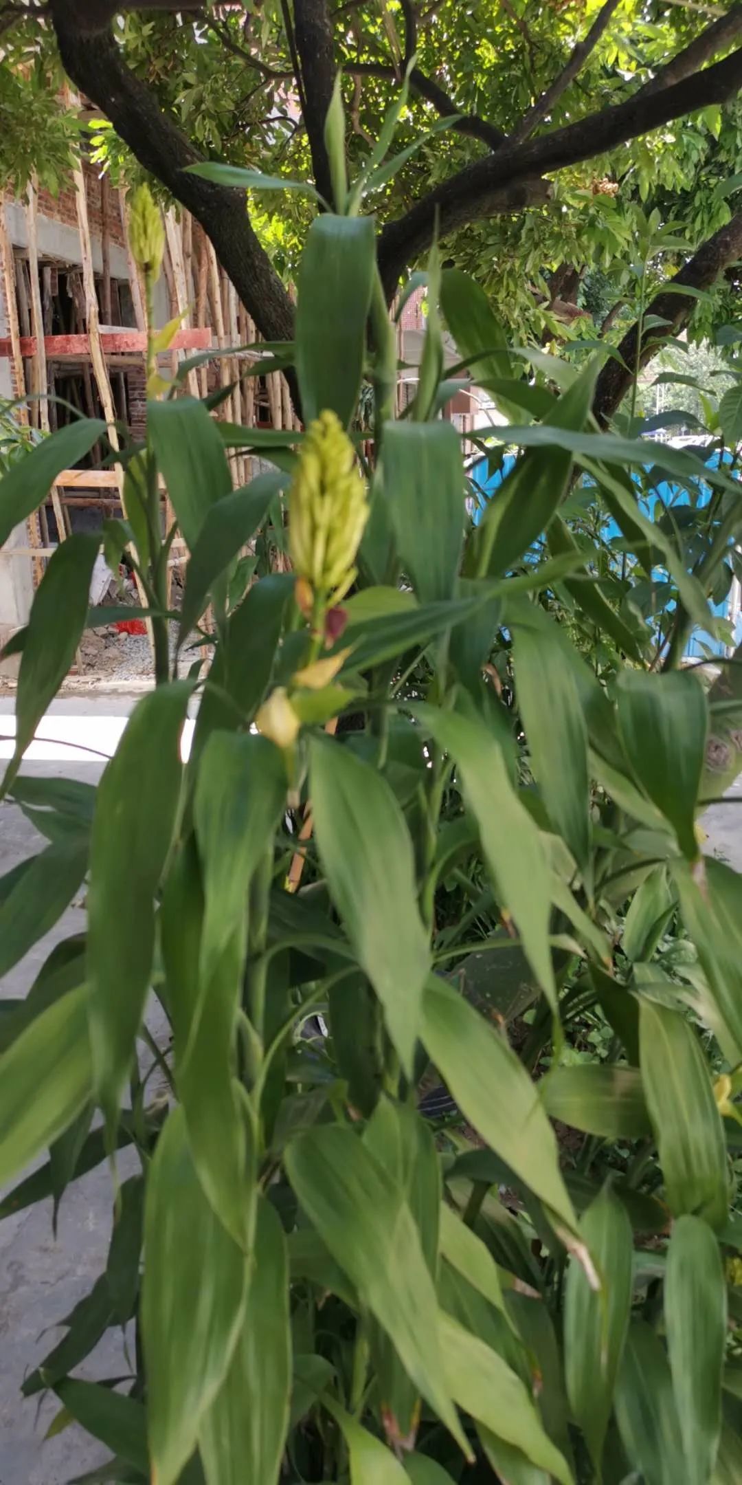 这是村里种在户外的富贵竹,今天刚开始孕育花苞,苞片都还没掉,估计过几天就开花了。