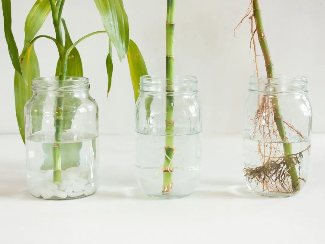 等过了两三周之后,富贵竹的枝条底部长出较多的新根,就可以在盆底添加一些小鹅卵石,起到装饰和固定枝条的作用,根系长长了,就不需要频繁换水,只需要等水变浑浊后,再及时更换清水,并清洗容器和根部就可以了。后期就等水温降低之后,再添加新的清水就可以了。