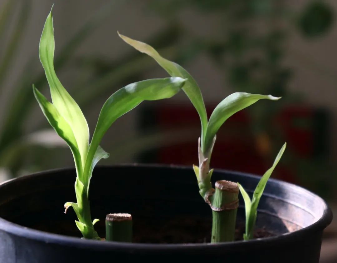 有些朋友的富贵竹只有一根光杆,上面长了一个小芽,这些小芽如果长大了(有7厘米以上),也可以单独切割下来,富贵竹顶部的小芽剪掉之后,富贵竹光杆小芽下一个节点处,可以重新萌发新芽,不要太过担心。