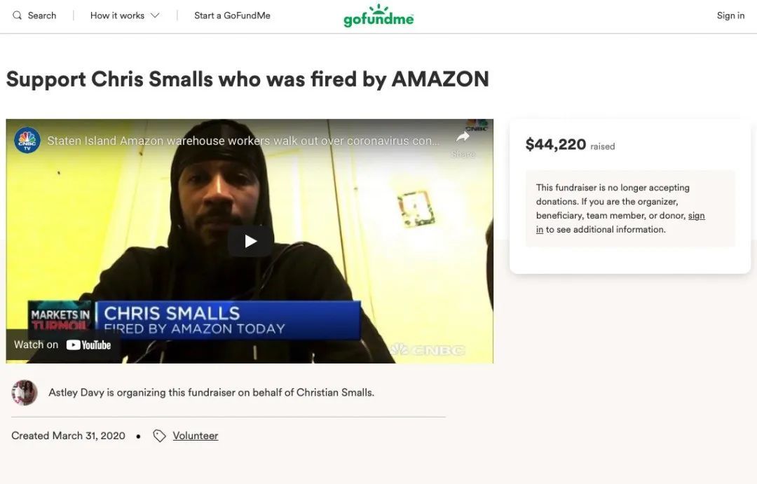 但斯莫尔斯没有想到的是,几个小时之后他和另外一名组织者就被亚马逊开除了。更为讽刺的是,他组织罢工是为了要求亚马逊重视防疫和工人安全,而亚马逊开除他的理由却是违反隔离规定,组织多人聚会,危及他人健康。
