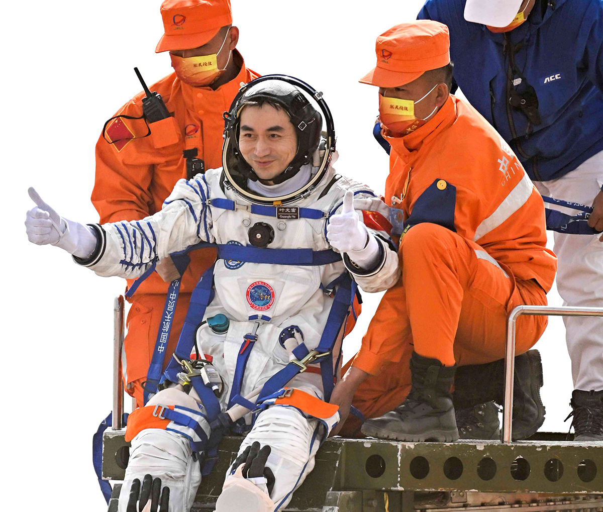 4月16日,神舟十三号载人飞船返回舱在东风着陆场成功着陆。这是航天员叶光富安全顺利出舱,身体状态良好。