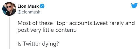 △马斯克4月9日在推特上发布消息:“这些‘顶级’账户中的大多数很少发推文,发布的内容也很少。推特要死了吗?”