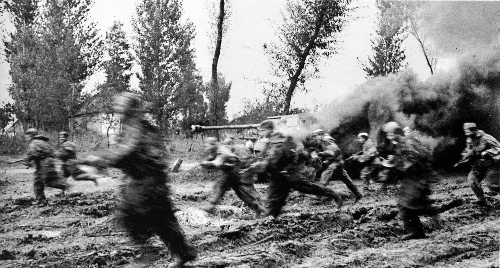 1943年9月苏军对波尔塔瓦发起进攻,旁边是1辆燃烧着的德军自行火炮