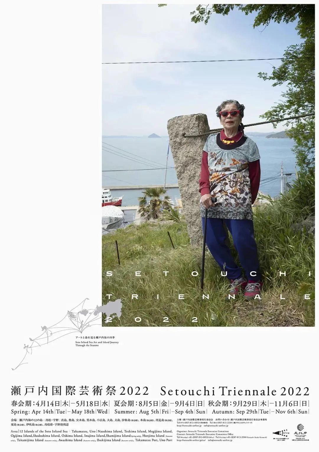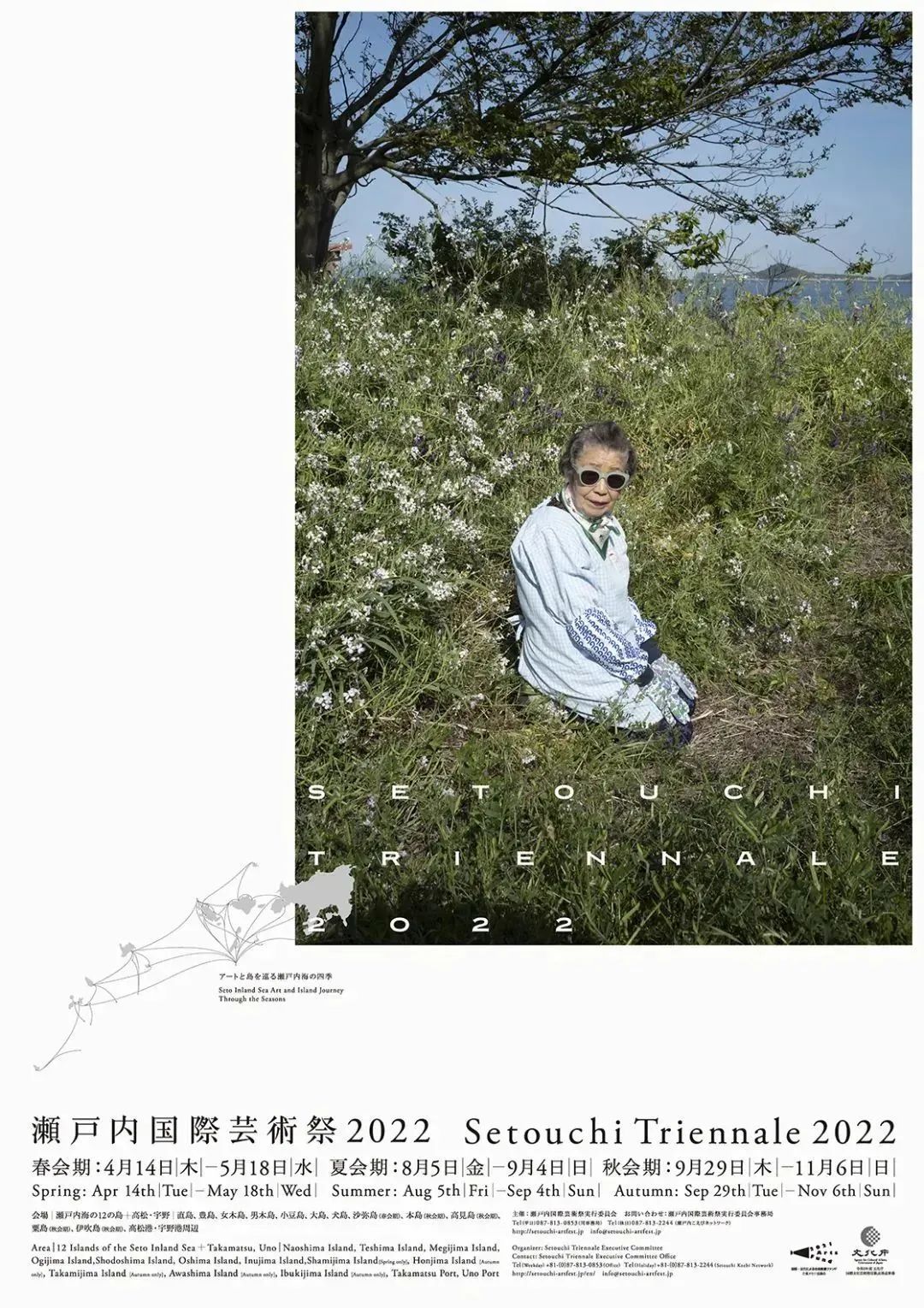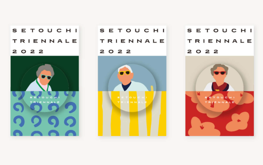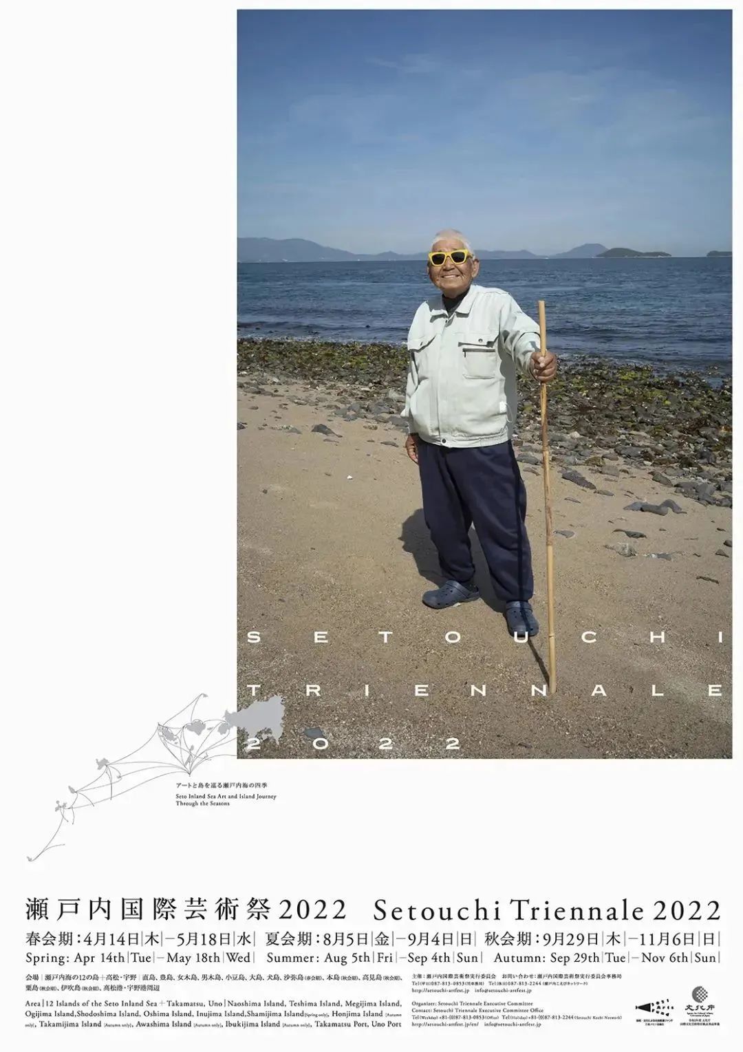 之前,濑户内国际艺术祭2022主视觉有发布过三个版本,由原研哉并联手摄影师上田义彦,每个版本由一位岛民作为模特儿,原研哉刻意让爷爷奶奶们以日常衣着出现在草地、海滩,并戴上浮夸墨镜拍照摆pose。