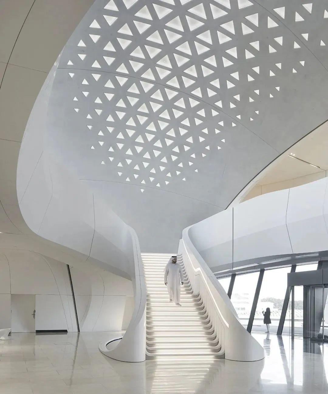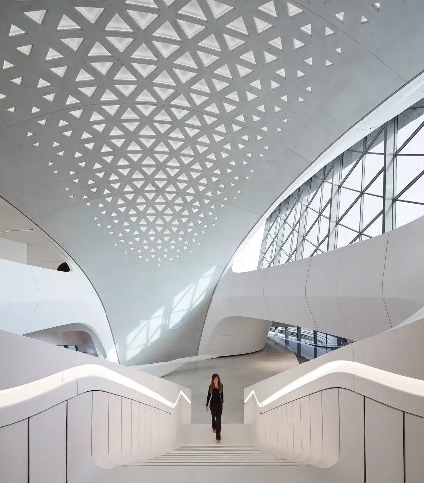 在内部,建筑两侧的“沙丘”通过中央庭院相互连接,扎哈·哈迪德事务所的建筑师将其描述为“建筑内的绿洲”,这是自然通风系统不可或缺的一部分。