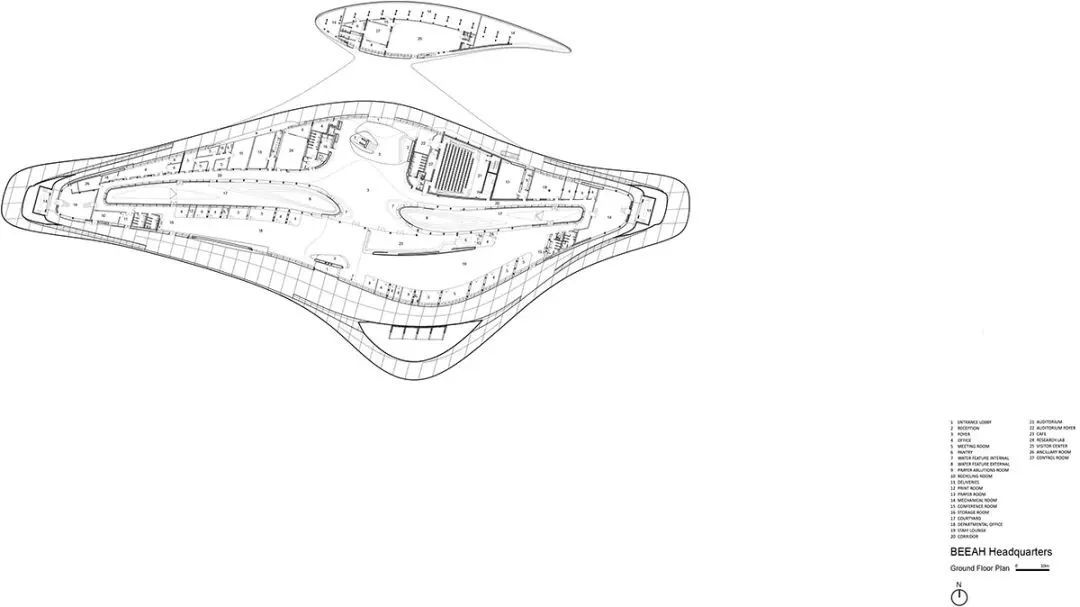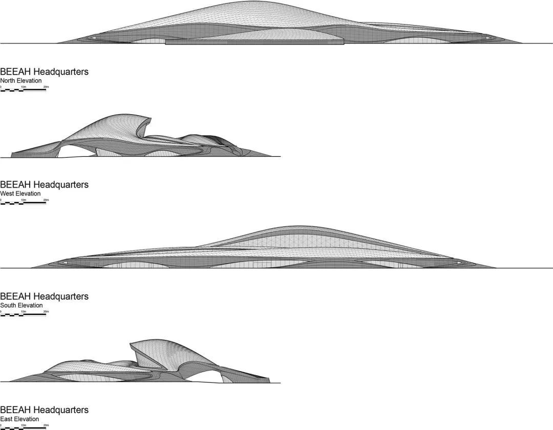 扎哈·哈迪德 的设计将 BEEAH 所推崇的可持续发展原则和创新解决方案融合在一起——创造出一组相互连接的“沙丘”。它们的方向和形状可以适应当地的气候条件,造型语言模仿当地沙漠中的凹形沙丘(由沙漠盛行季风形成),使建筑融入沙漠环境。
