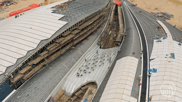 工人在已完成的屋面结构上铺设GRC预制板,GRC板与屋面嵌板严格对应,形成建筑灵动的曲线。
