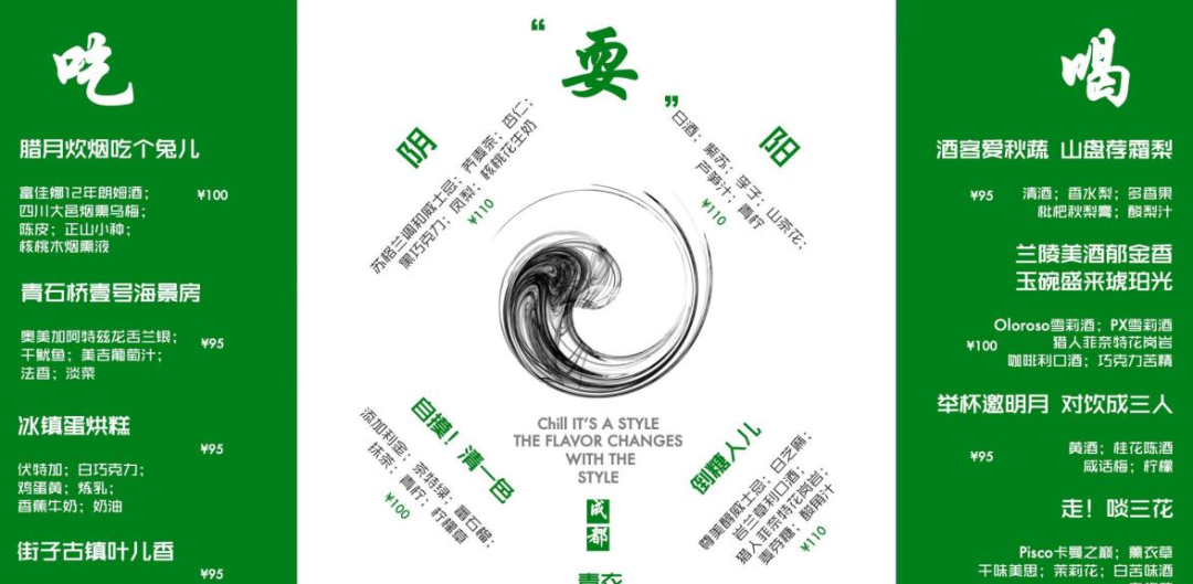 John和很多其他本土的鸡尾酒吧主理人一样,看到了这样的市场空白,亲自出任产品经理,在不断尝试去做研发。John分享给我一份最新版本的酒单,他们专门做了成都主题的鸡尾酒。从吃、喝、耍三个维度入手,将成都传统小吃、传统街道、白酒甚至麻将的元素都融入进来,其实目的也很简单,不想大家喝到成都特色的鸡尾酒时,永远都只有麻和辣两个被用烂的元素。