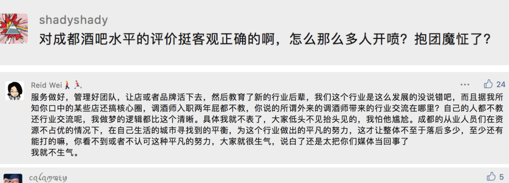 主要的争议点来自作者引用采访对象的描述——“成都优秀的、满怀热情的调酒师也远没有广州等一线城市多”——这让大家破防,一部分认为作者趾高气昂,不尊重成都本土鸡尾酒文化;也有一部分认为这是成都鸡尾酒行业的不自信与格局小,双方争执不下。