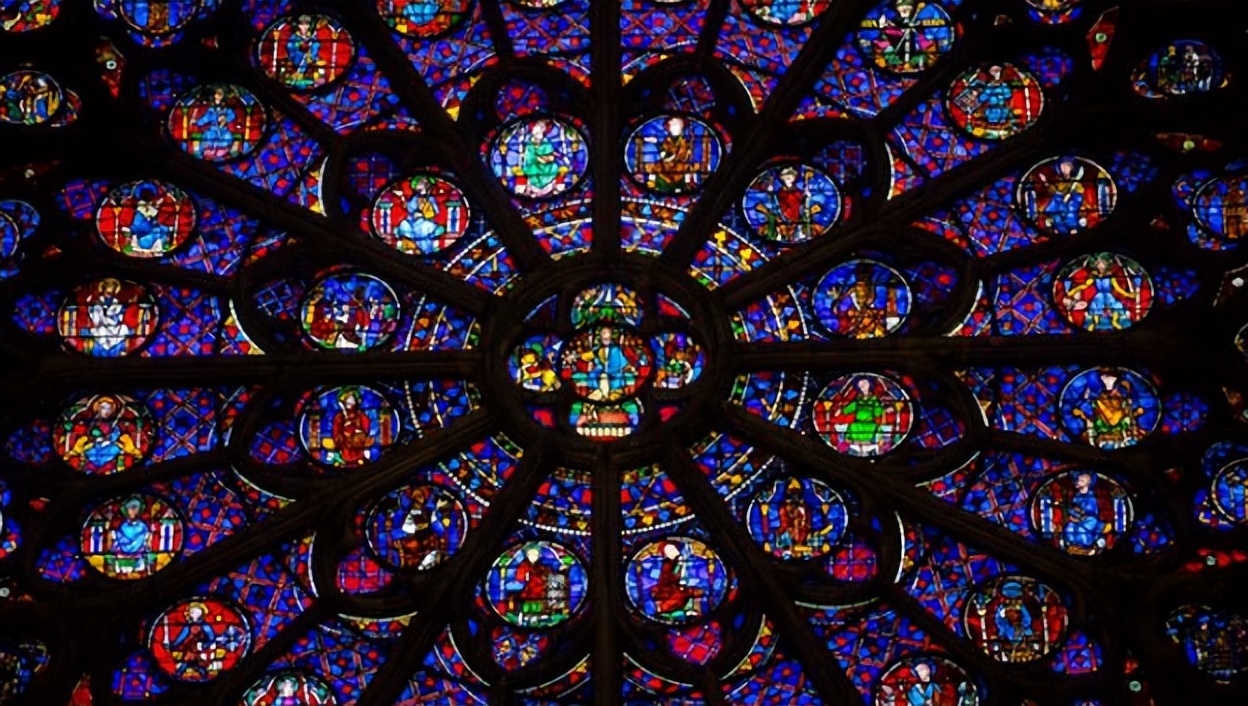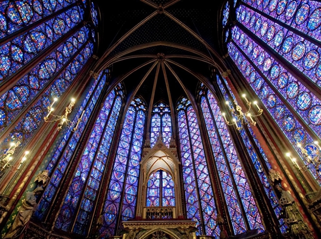 花窗玻璃造就了教堂内神秘灿烂的景象,从而改变了罗马式建筑因采光不足造成的沉闷压抑,并表达了人们向往天国的内心理想。(玻璃着色主要为蓝、红色。蓝色代表天堂,红色代表基督之血)