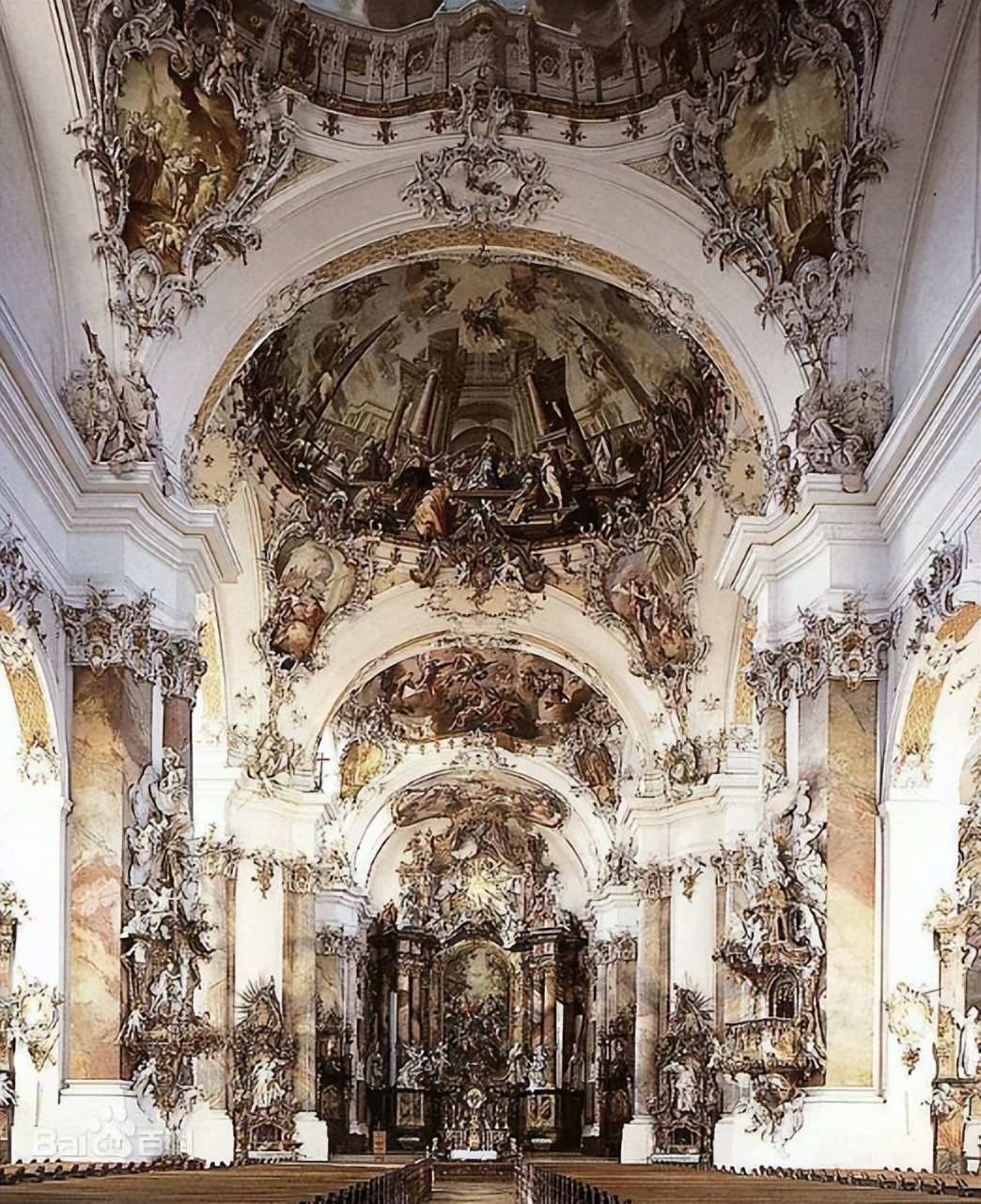 (4)巴洛克装饰通常用于教堂内部和外部。洛可可很少运用于教堂,多为欧洲宫廷等装饰风格。