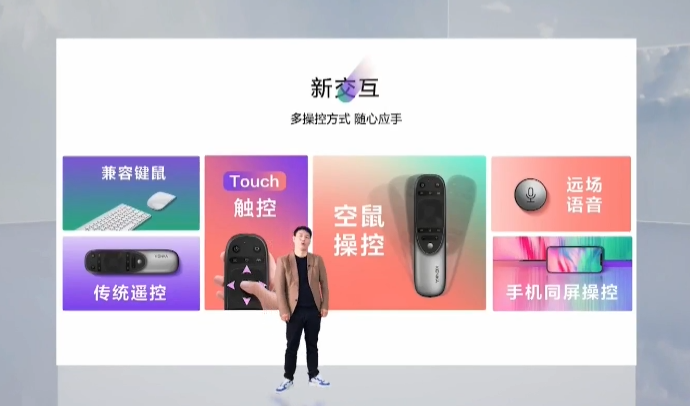 新交互方面,ME 柚 OS 系统支持传统遥控、键鼠、Touch 触控、空鼠操控、远场语音、手机同屏操控等,遥控器的 OK 键是一个触控板,还可在空中摇晃遥控器移动电视中的光标。