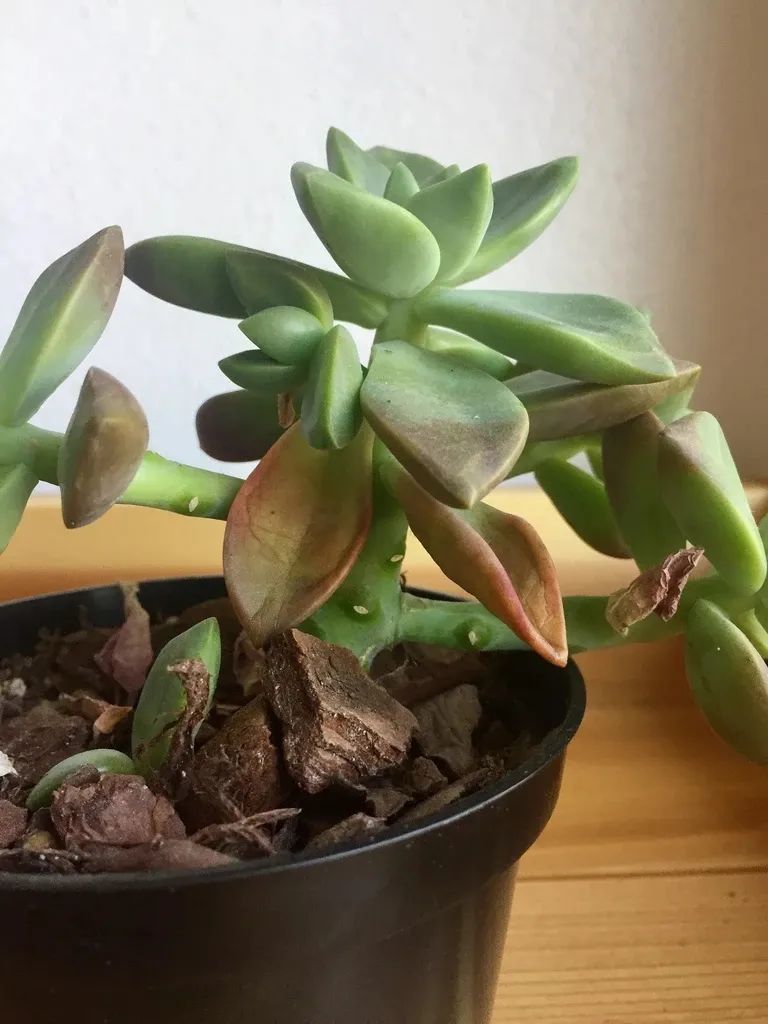 这是因为浇水过多,导致多肉叶片里的细胞壁破裂,最终就会导致水分无法储存到叶片里,最终会导致叶子的颜色发黄,接着叶片开始腐烂发软,最终会变成棕黑色,这些叶片就会不断掉落下来。