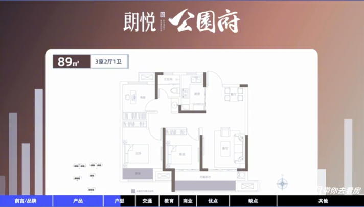 主力户型肯定是89㎡的小三房,格局方正,三开间朝南,餐客一体,三段式分离的卫生间,联通客卧的阳台,赠送部分阳台和飘窗,朗悦总算是总结出了经验,89㎡的小三房真的比90多㎡的三房好卖。
