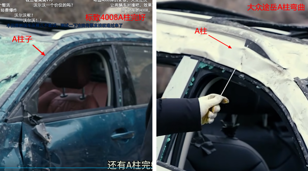 此次参与测试的都是以“品质”著称的欧系车——大众途岳和标致全新4008,测试结束时大众途岳的A柱已经发生弯曲,车身框架变形,车尾严重溃缩,车门无法正常开启,如果是真实情境下,车内人员很难逃离自救。