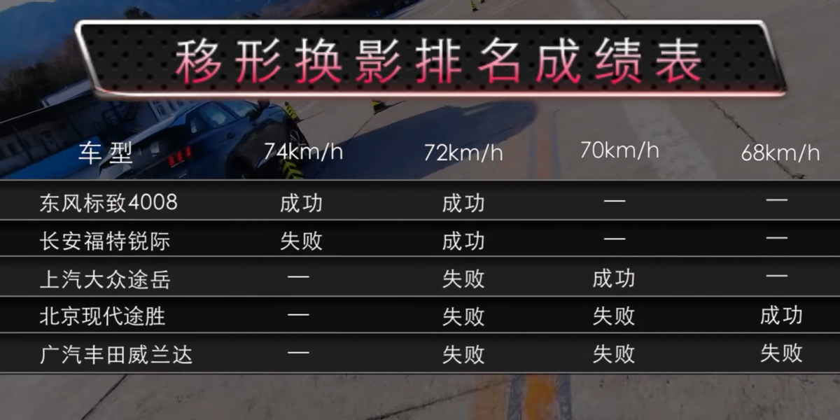 而本次测试中自然也参考了这一规定,五辆车在同一专业赛车手驾驶下,以72KM/H的车速进行操控稳定性比拼,但只有福特锐际和标致全新4008挑战成功。随后第二轮时速74KM/H的挑战中,福特锐际输在了最后一个急转弯中,而标致全新4008则挑战成功,在五款合资SUV麋鹿测试中位列第一名。