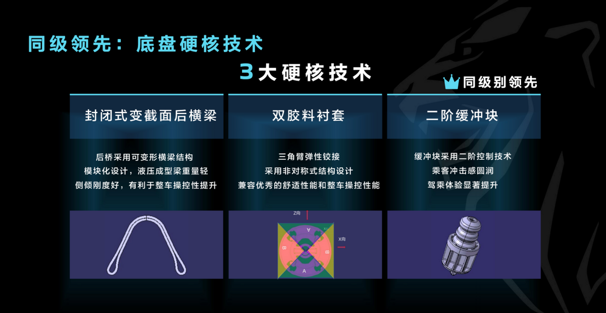 该技术采用了国内领先的内高压成型工艺,液压成型梁的重量轻,倾斜刚度好,能够提升整车的操控性,相比于独立悬挂拥有更好的稳定性,还节约了后期维修养护成本。