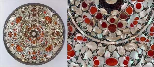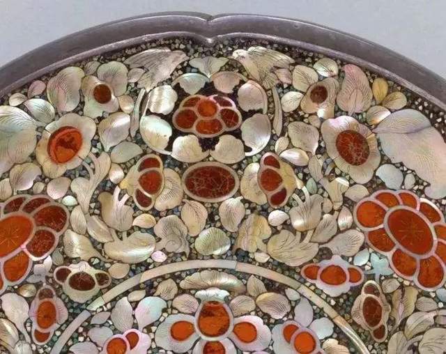 把贝壳磨制成各种形状或图案,镶嵌在漆器表面的螺钿工艺,有时还会加入玛瑙、玳瑁、红珊瑚、绿松石等宝石,华丽而雍容。