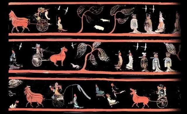 这一时期,还集中爆发出多种漆器装饰工艺。首先是漆绘,用调色后的大漆在涂好底漆的器物上描绘出各种图案,叫做描漆。漆绘在当时应用最为广泛。其次就是锥画——用锥形工具代替画笔,在漆器表面刻画图案。锥画还催生出另外两种工艺,在锥刻出的线条中填入彩色的大漆叫填漆,填入极细的金银箔,叫戗金。