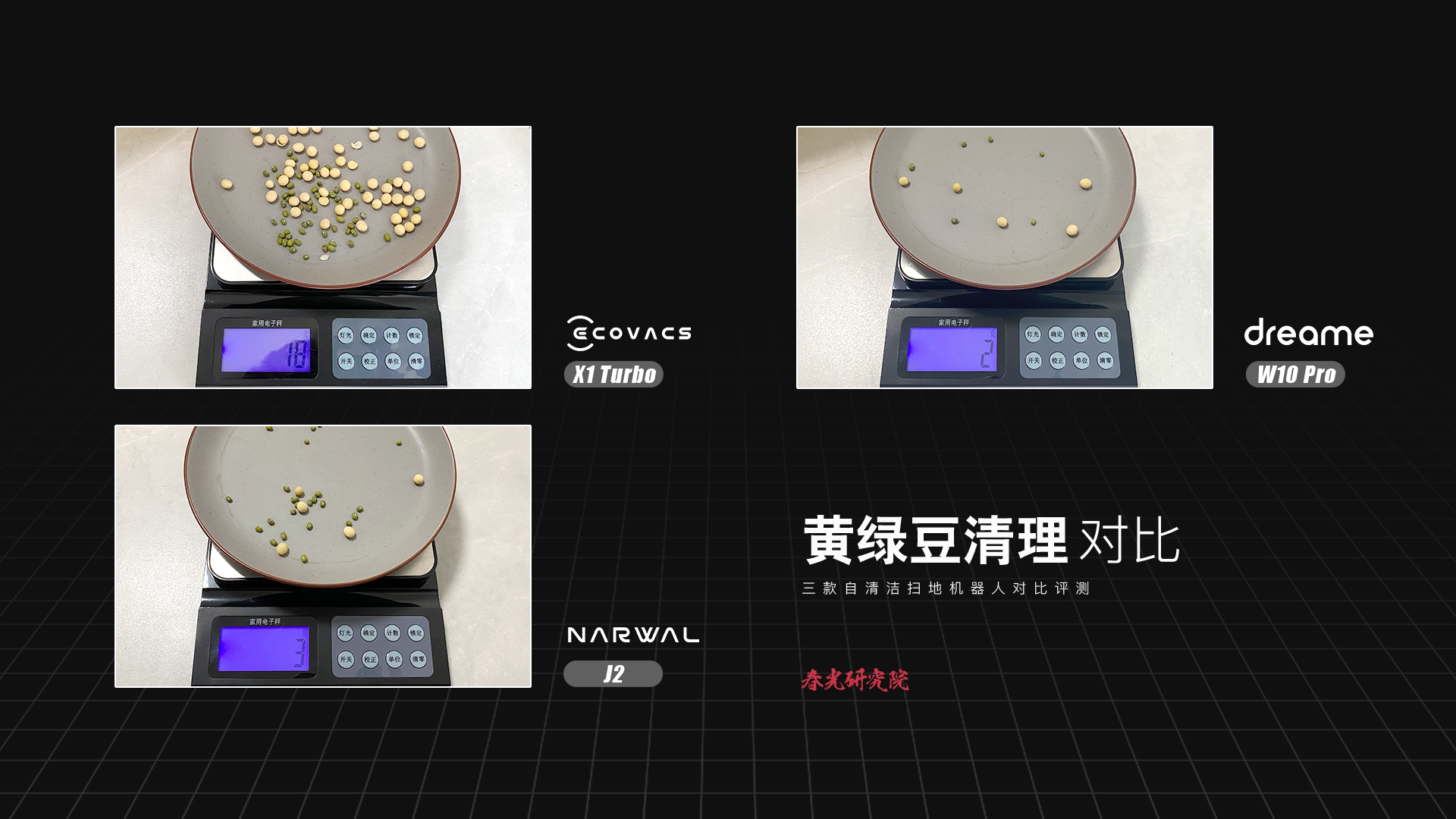 在清理完之后,我们将剩余豆子收集起来进行称重,最终的结果是科沃斯剩余18g,追觅剩余2g,云鲸剩余3g。