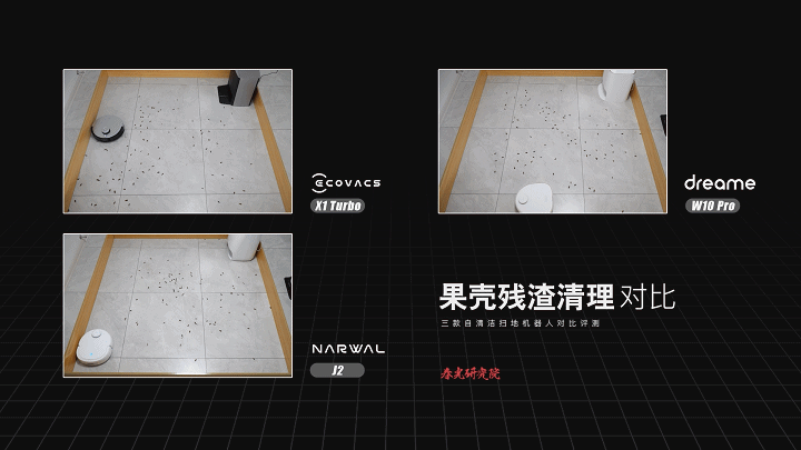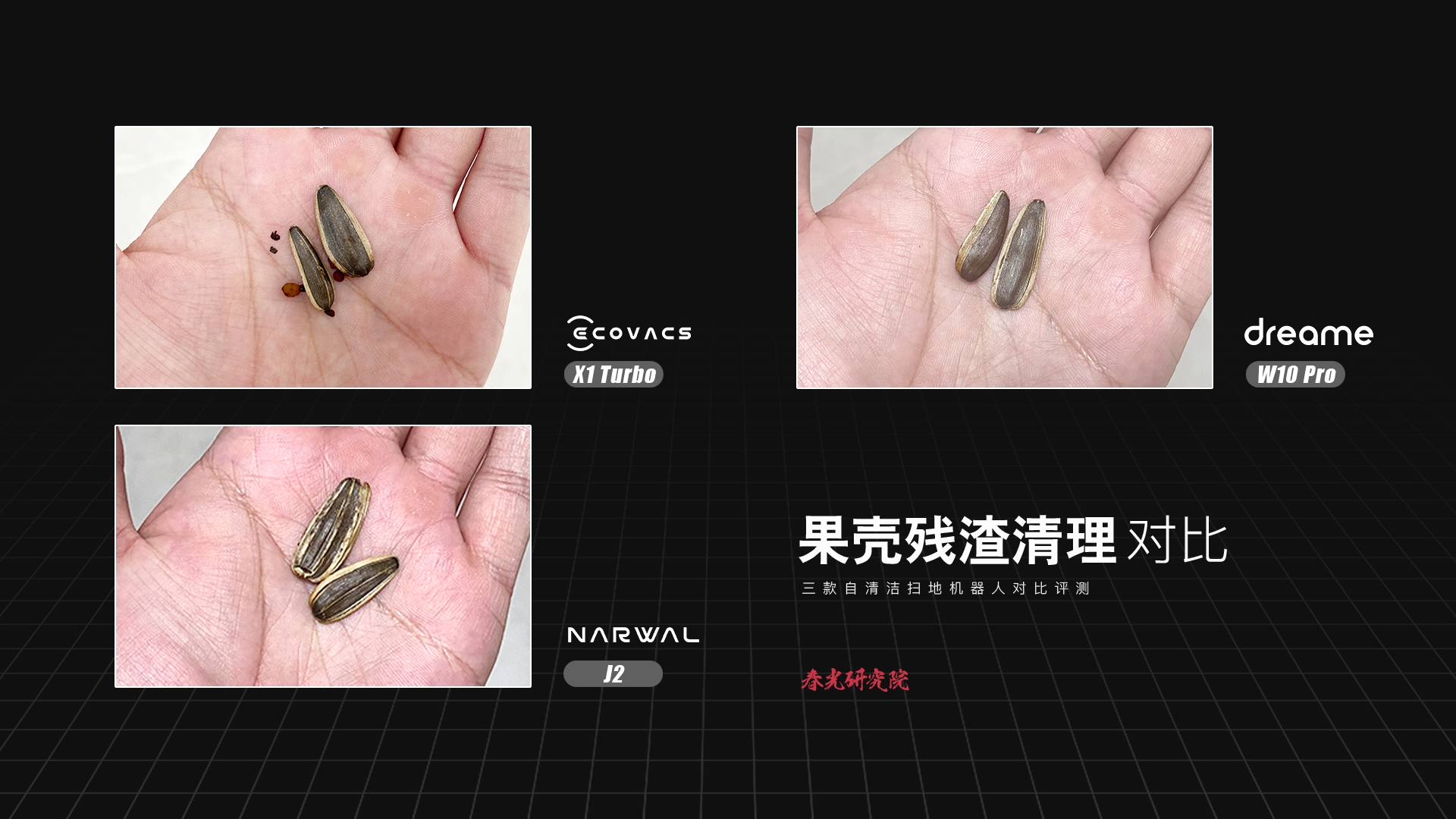 在一轮清理之后,三款产品的表现都不错,也都是先绕圈后弓字型的行进逻辑,最后的结果是:零食残渣都清理干净了,仅剩下2颗果壳。