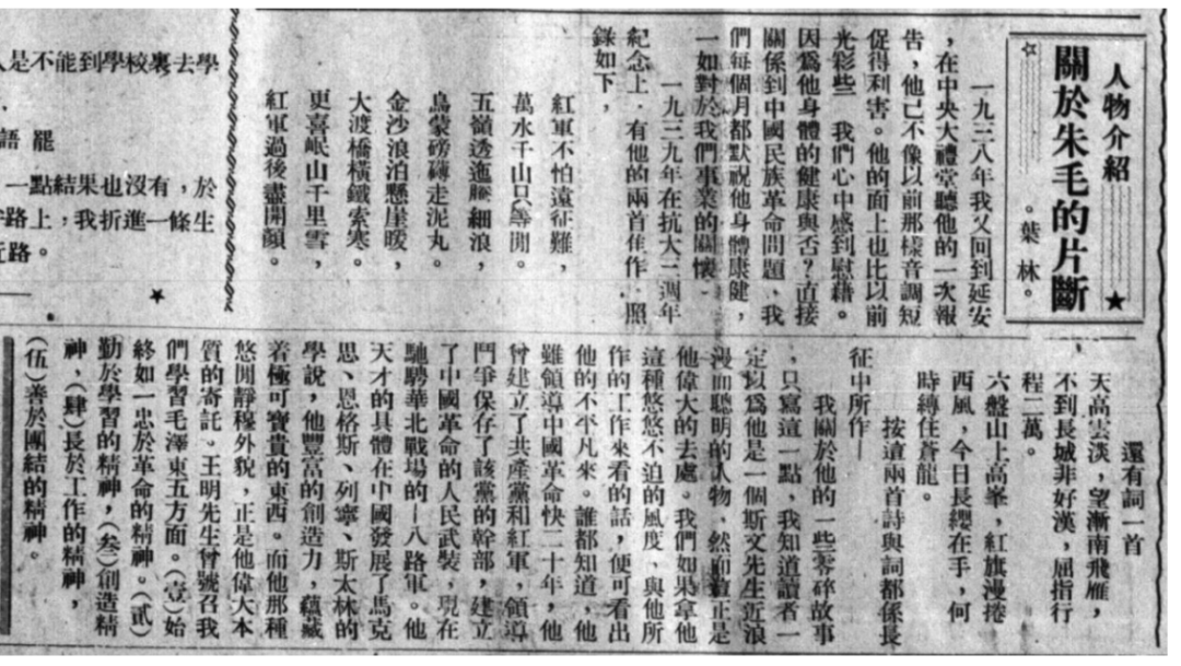 然而,近年有学者发现,早在1941年2月胡适就在日记中抄录、粘贴了《美洲华侨日报》上刊登的《六盘山》词。为了弄清楚当年《美洲华侨日报》是否真的刊登《六盘山》词,以及刊登的具体情况,笔者几经周折,终于在中国华侨历史博物馆查到当年的《美洲华侨日报》,找到了披露《六盘山》词的《关于朱毛的片断》一文。80多年前所刊毛泽东《六盘山》词,终于展露在我们面前。这应当是目前所见毛泽东《六盘山》词在报刊上最早发表的版本。