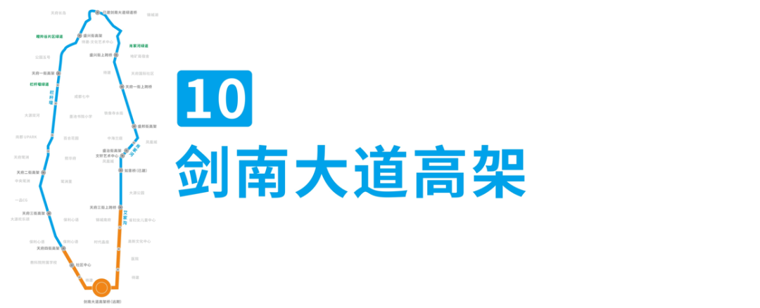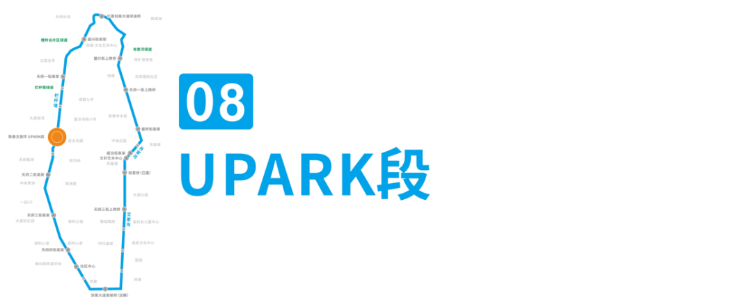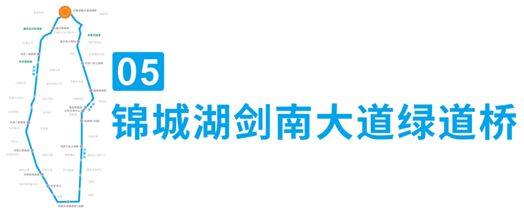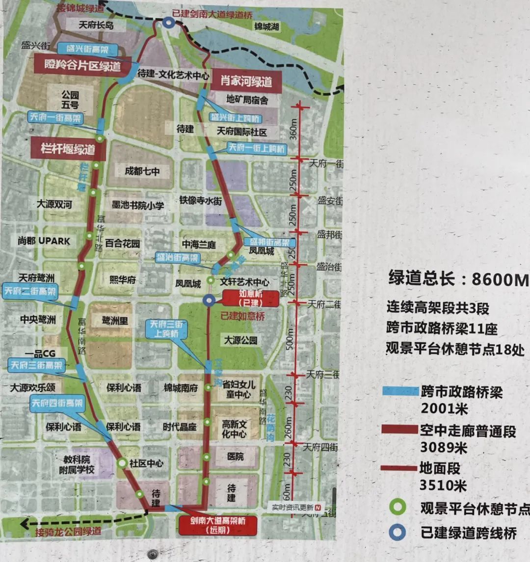 这是一条长达8.6公里的空中绿廊,串联起瞪羚谷、铁像寺、锦城湖、大源中央公园、骑龙公园等文创旅游节点,并与交子公园商圈、锦城绿道、锦江绿道等绿道系统相互连通。