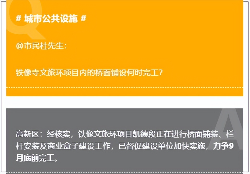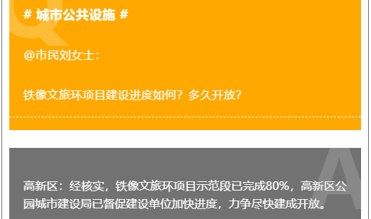 按照计划,铁像文旅环将被打造成为高新特色的慢生活城市步道,因此备受关注。自去年下半年开始,关于它的建设进度也频频出现网络理政平台。