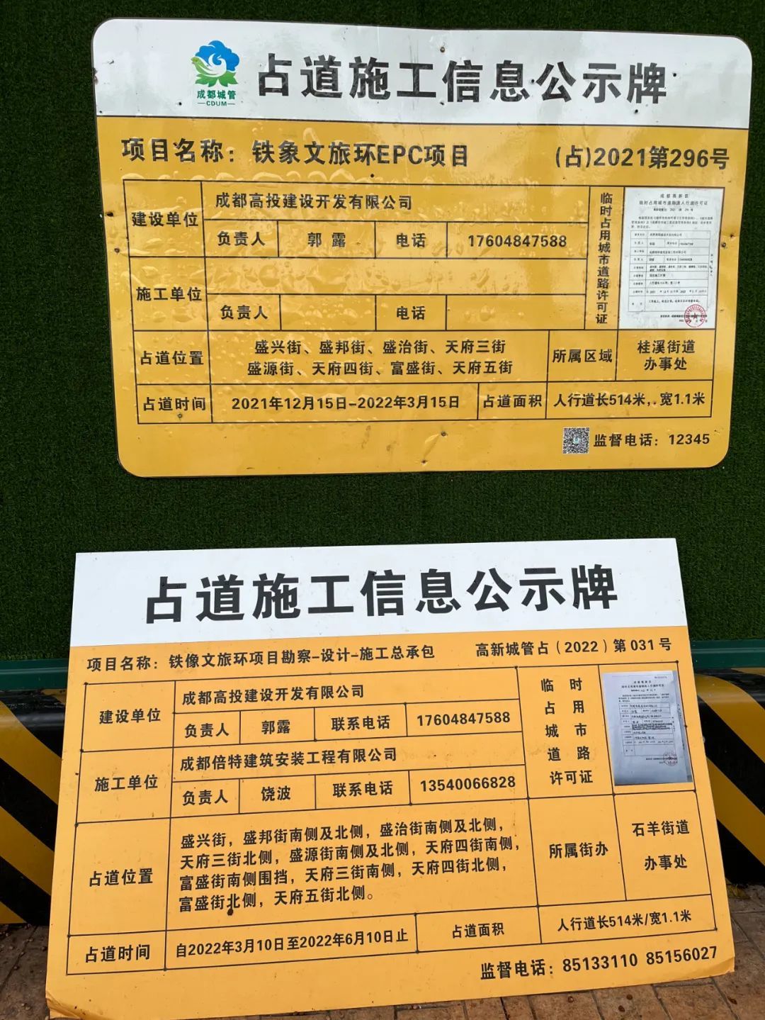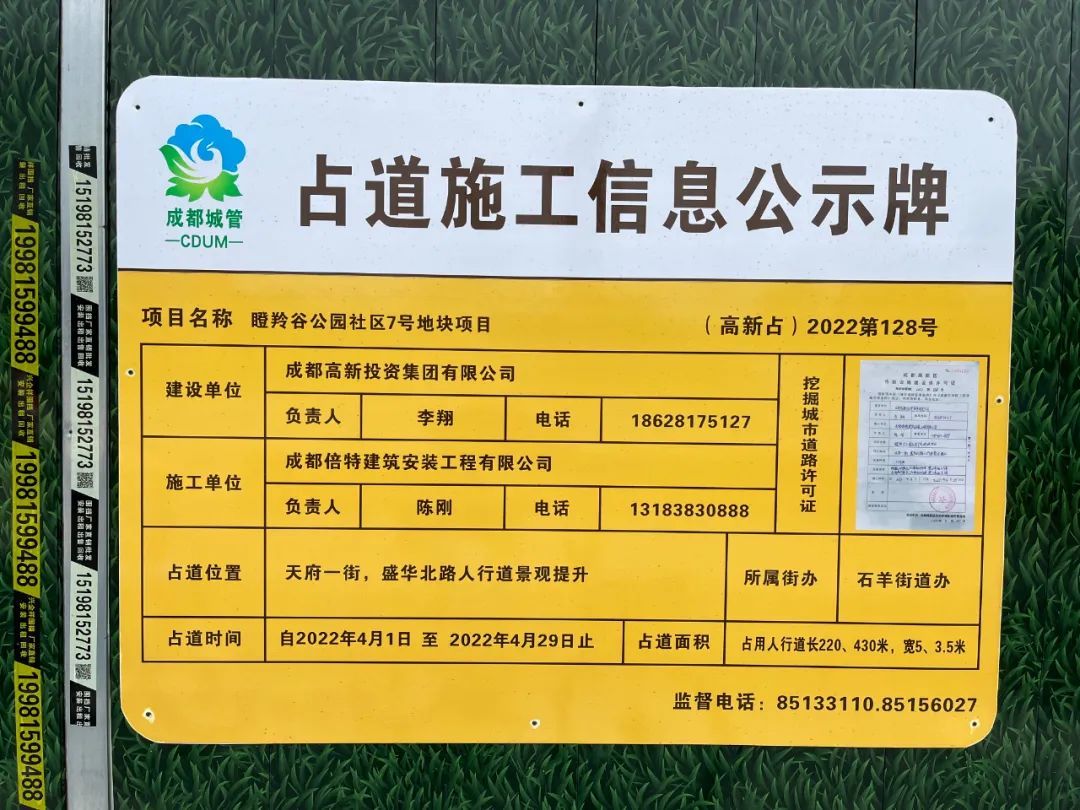 位于盛兴街与盛通街交汇处打围的施工现场,产爷看到原本的占道施工信息公示牌已被更换。新旧公示内容在占道位置、占道时间等均有不同,并增加了施工单位信息。